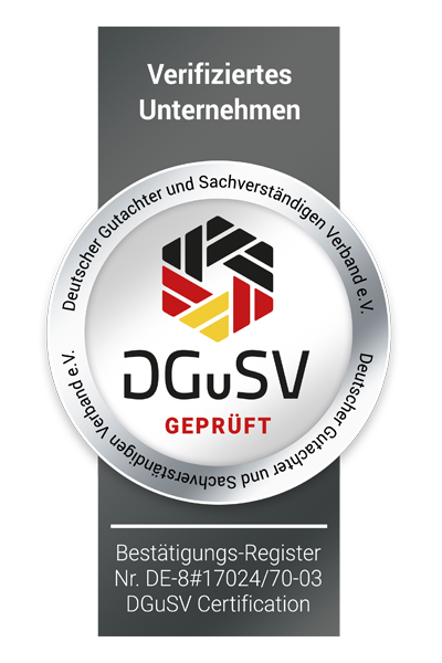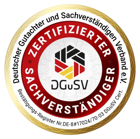 Offiziell zertifizierter Sachverständiger im DGuSV mit dem Bestätigungs-Register Nr. DE-8#17024/70-03